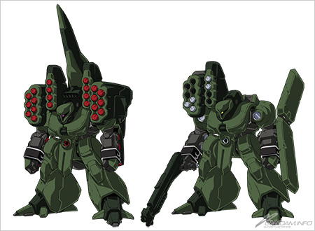 アクシズの戦艦「エンドラ」にテスト用として配備された機体。全身いたるところに内蔵された「ミサイル・ランチャー」による高い攻撃力を持ち、背部ウェポン・ラックに最大4基の「ミサイル・ポッド」を追加することで、さらに攻撃力をアップさせることができる。