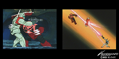 ズゴックの高速戦闘はジムを一瞬で葬り去り、ガンダムを発見してシャアは冷酷に笑みを浮かべる。全編を通じて屈指の名場面。シールドを貫いて反撃するアムロとガンダムの強さにも注目だ。