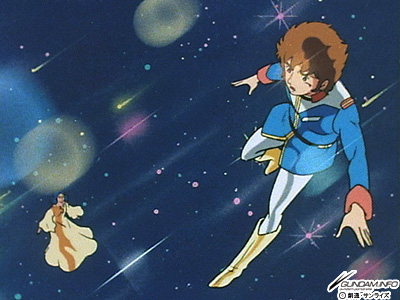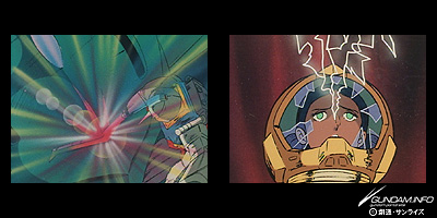 出撃直前、シャアに抱擁されキスを受けるララァ。大佐への心配をノーマルスーツの着用を願うことで表現する。そして、唇に残った感触を手で確認するララァ。今回主眼となるララァの悲劇は、アムロと精神的には交歓できたものの、結局はシャアとの肉体関係を優先したことが原因だ。落着点への伏線は、この「肉体的接触」で自然に埋めこまれているのだ。